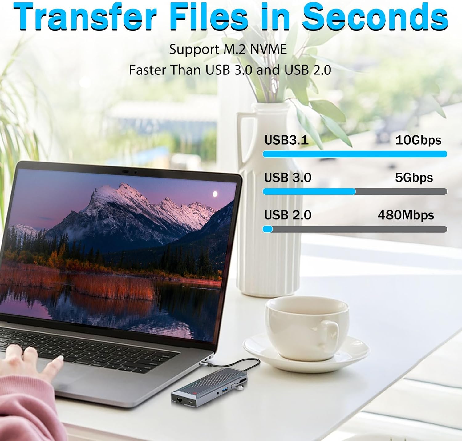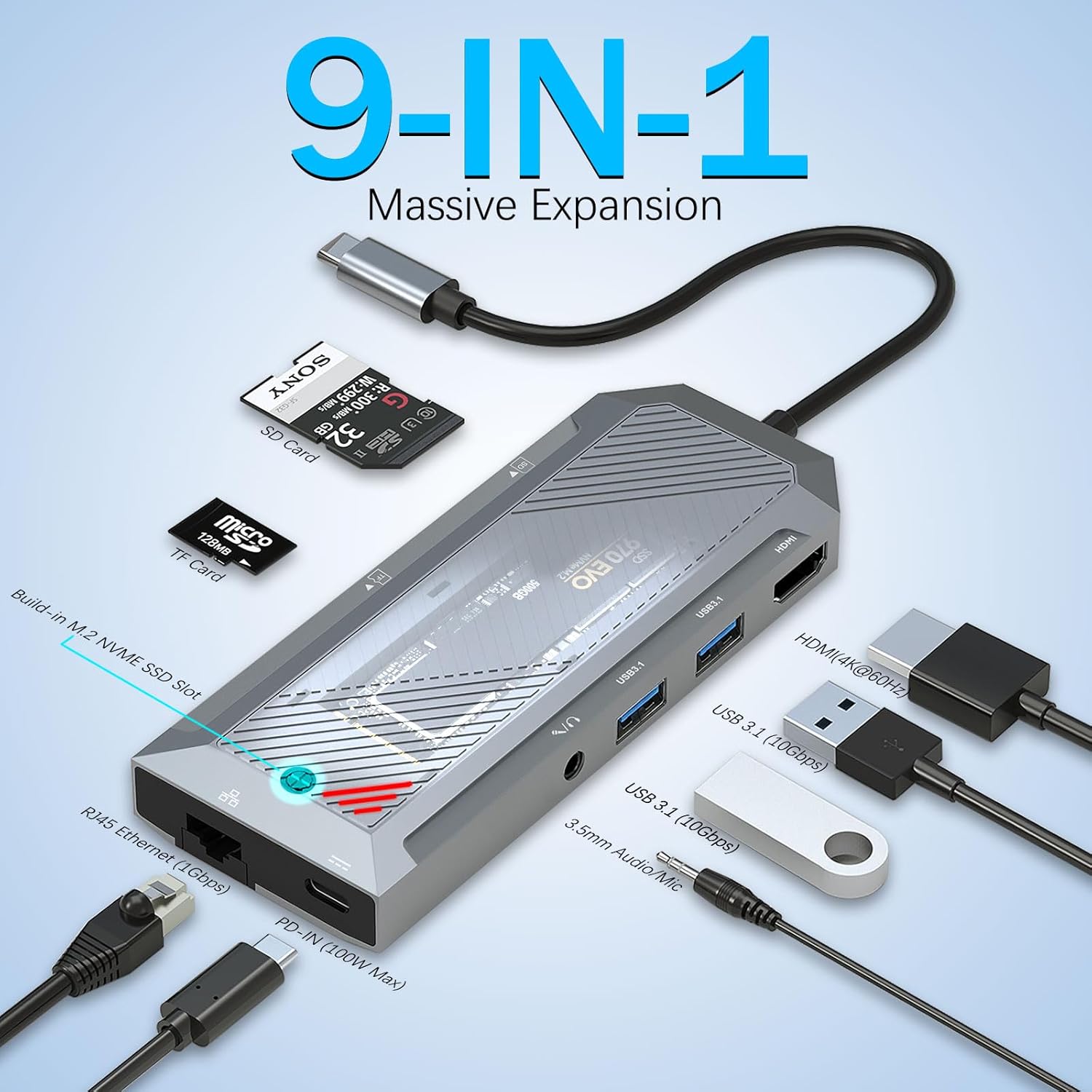 9-in-1 USB-C Hub karo SSD Enclosure kanggo M.2 NVMe 4K 60Hz HDMI Splitter – Konektivitas Ultimate lan Ekspansi Panyimpenan Kecepatan Tinggi