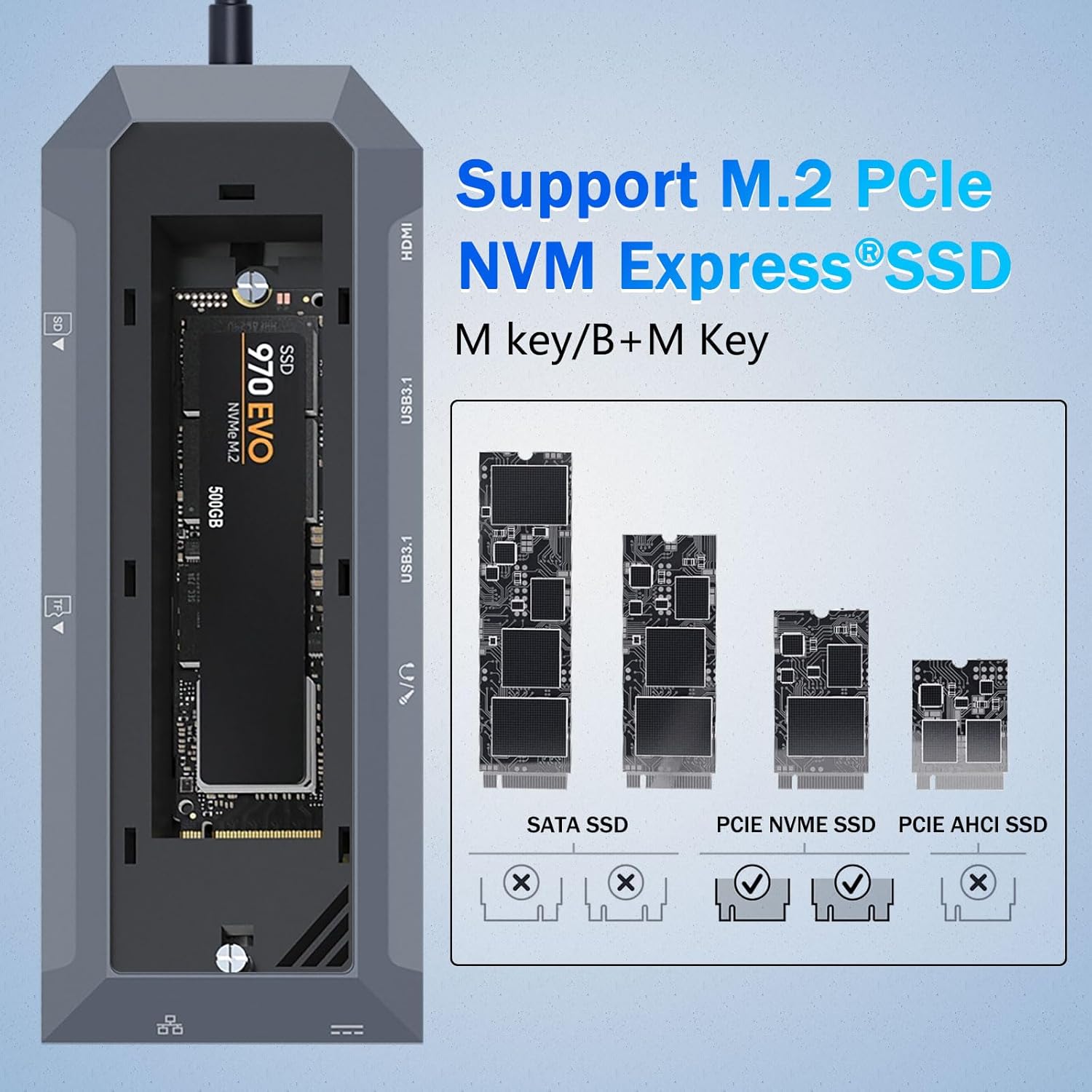 Boten kados hub USB tradisional, piranti iki kalebu pager SSD khusus sing ndhukung drive solid-state M.2 NVMe. Fitur iki ngidini pangguna nambah panyimpenan kacepetan dhuwur langsung menyang ruang kerja tanpa mbutuhake drive eksternal sing kapisah.