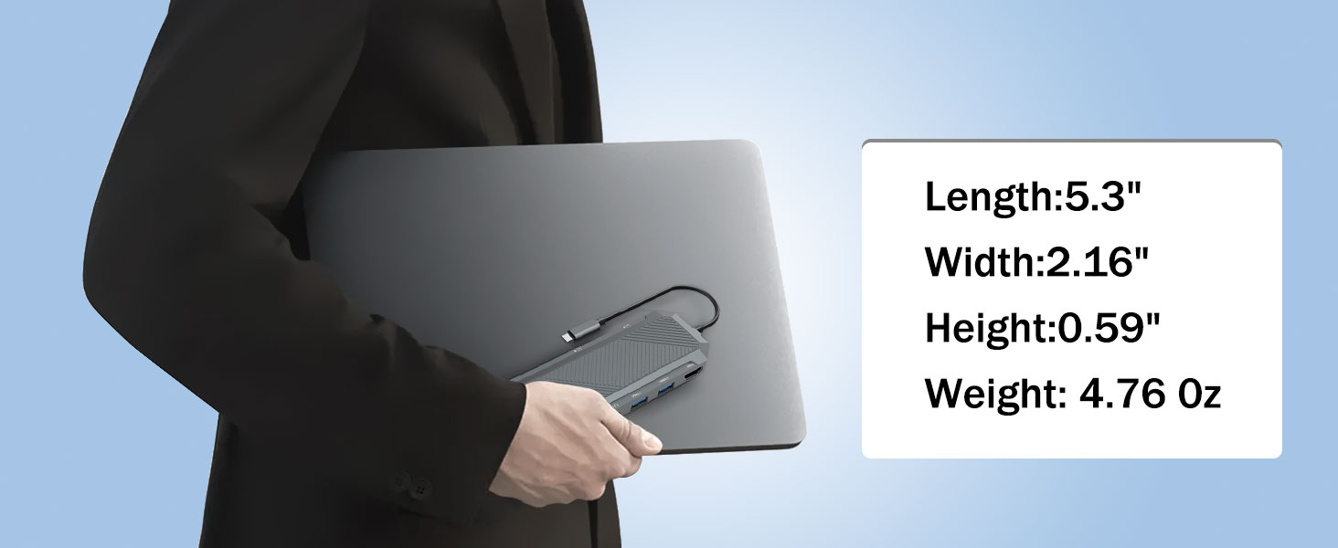Senadyan fungsi sing kuat, 9-in-1 USB-C Hub karo SSD Enclosure kanggo M.2 NVMe 4K 60Hz HDMI Splitter dirancang kanggo tetep kompak lan entheng. Iki nggawe gampang digawa ing tas laptop, tas ransel, utawa tas travel.
