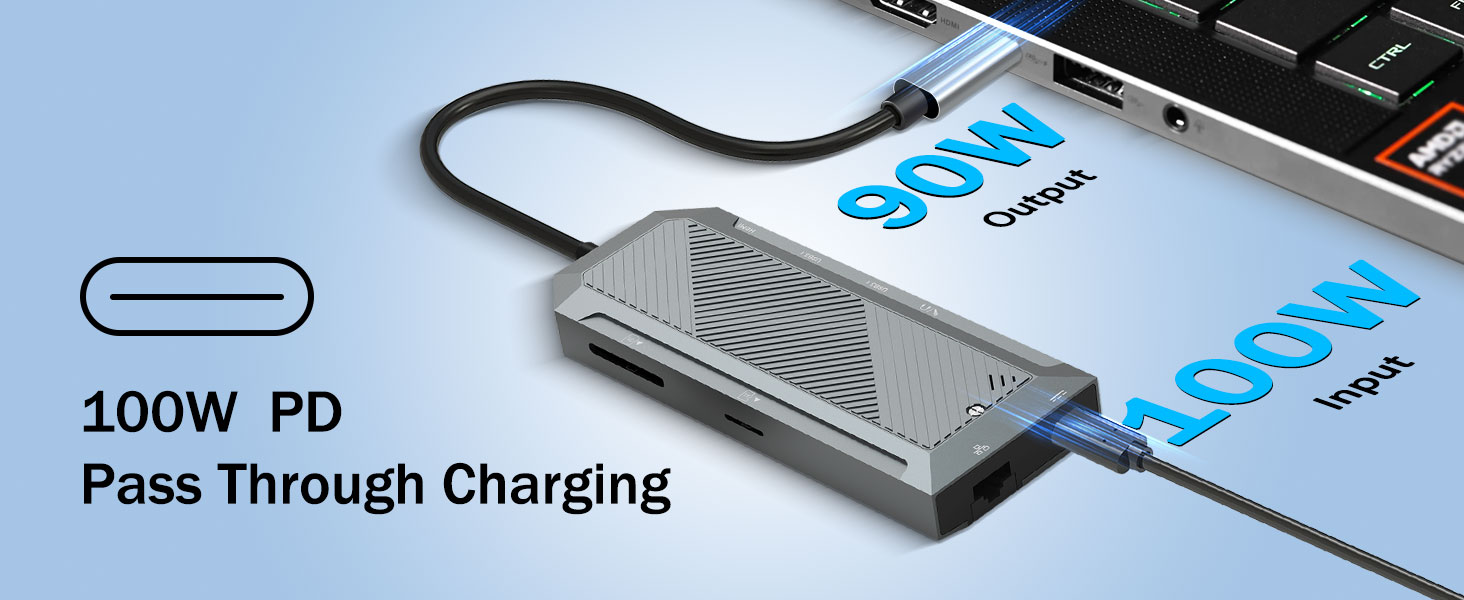 Dhukungan pangiriman daya njamin piranti tetep diisi daya nalika hub digunakake. Port USB-C PD ngidini daya ngliwati hub lan menyang laptop utawa tablet sing disambungake.