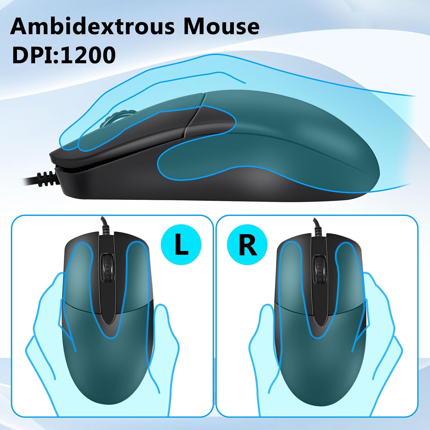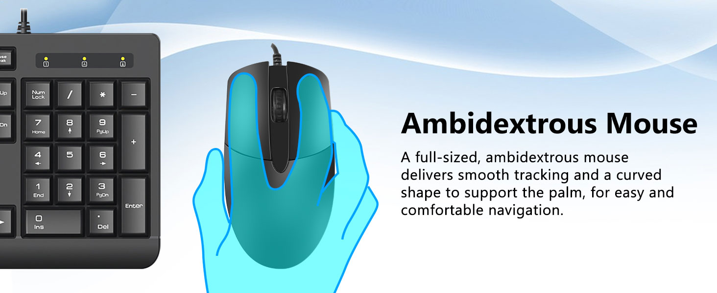 Tata letak keyboard ukuran lengkap kalebu keypad numerik, tombol multimedia, lan jarak sing nyaman ing antarane tombol. Mouse sing diiringi dirancang kanggo nelusuri akurat lan gerakan kursor lancar ing macem-macem permukaan.