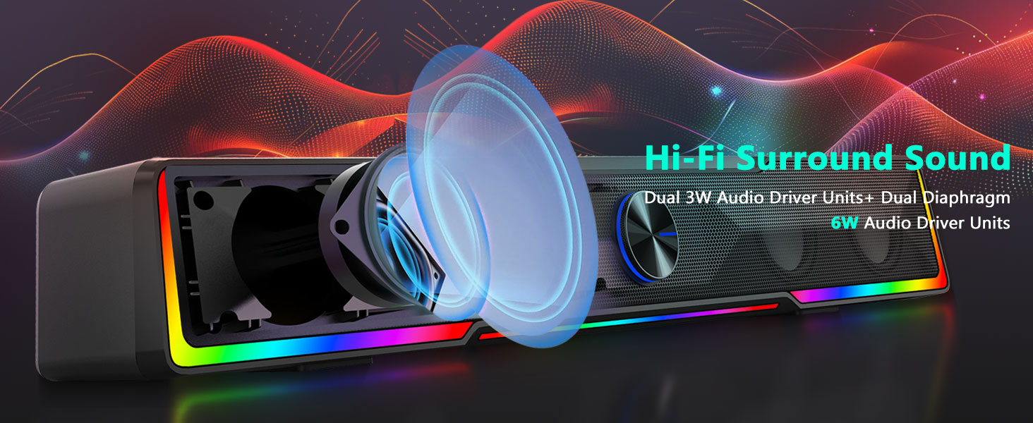 Dilengkapi driver stereo kuat, Black GS516 Bluetooth/USB Wired Connection Soundbar Volume Knob Speaker Komputer ngirim swara imbang karo vokal cetha, midrange rinci, lan respon bass ditingkatake.