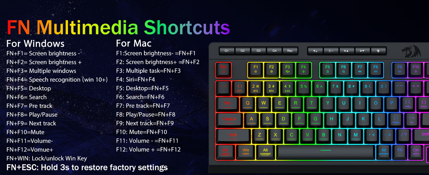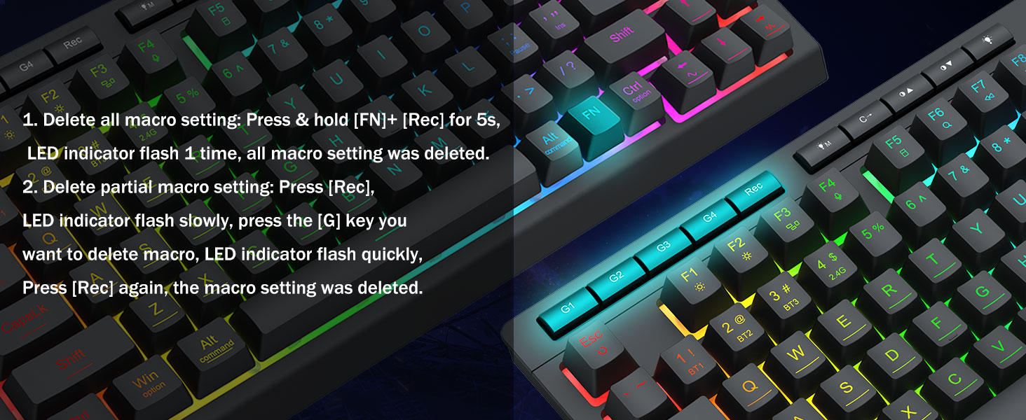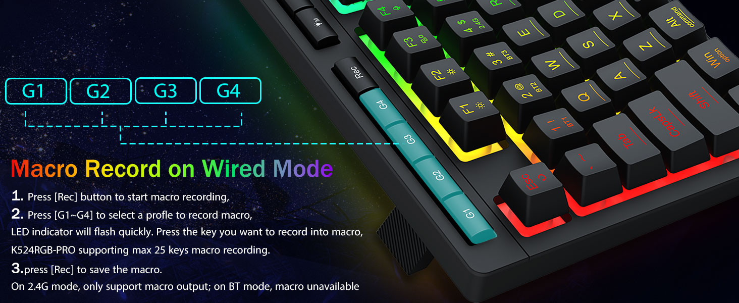 Dipasang makros, kontrol sing ora nyenengake- Program 4 tombol macro onboard (G1-G4) kanthi cepet-ora dibutuhake. Cekak komplek komplek kanggo game, trabasan kanggo produktivitas, utawa prentah media. Mbedakake alur kerja ing sawetara detik. Sampeyan uga bisa nggunakake piranti lunak kanggo ngatur fungsi, nggawe makro, nyetel lampu rgb, lan nyetel trabasan.