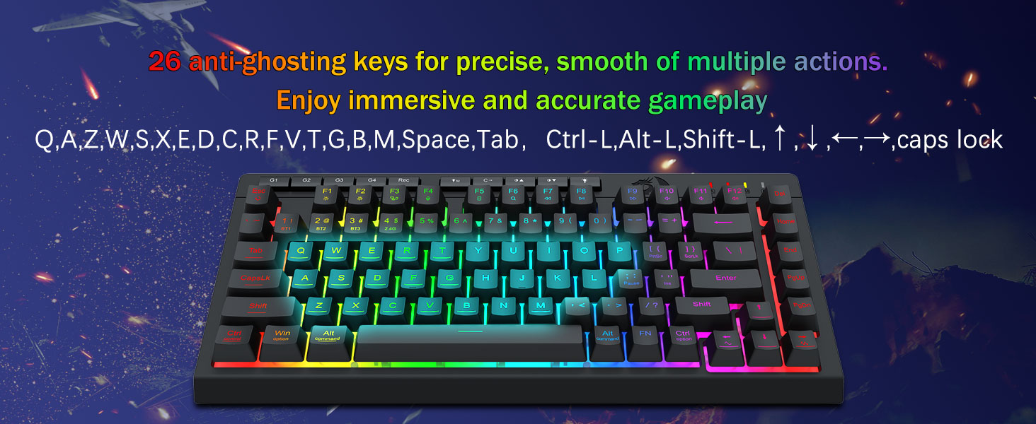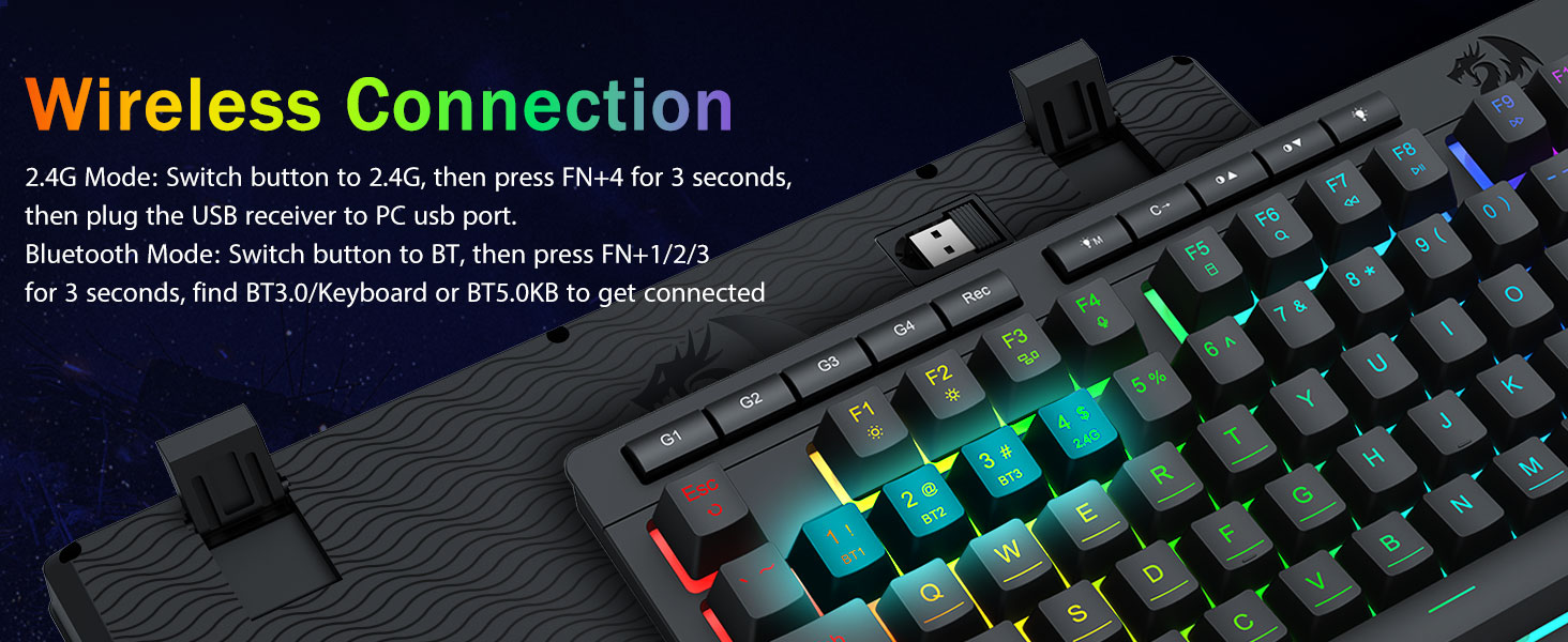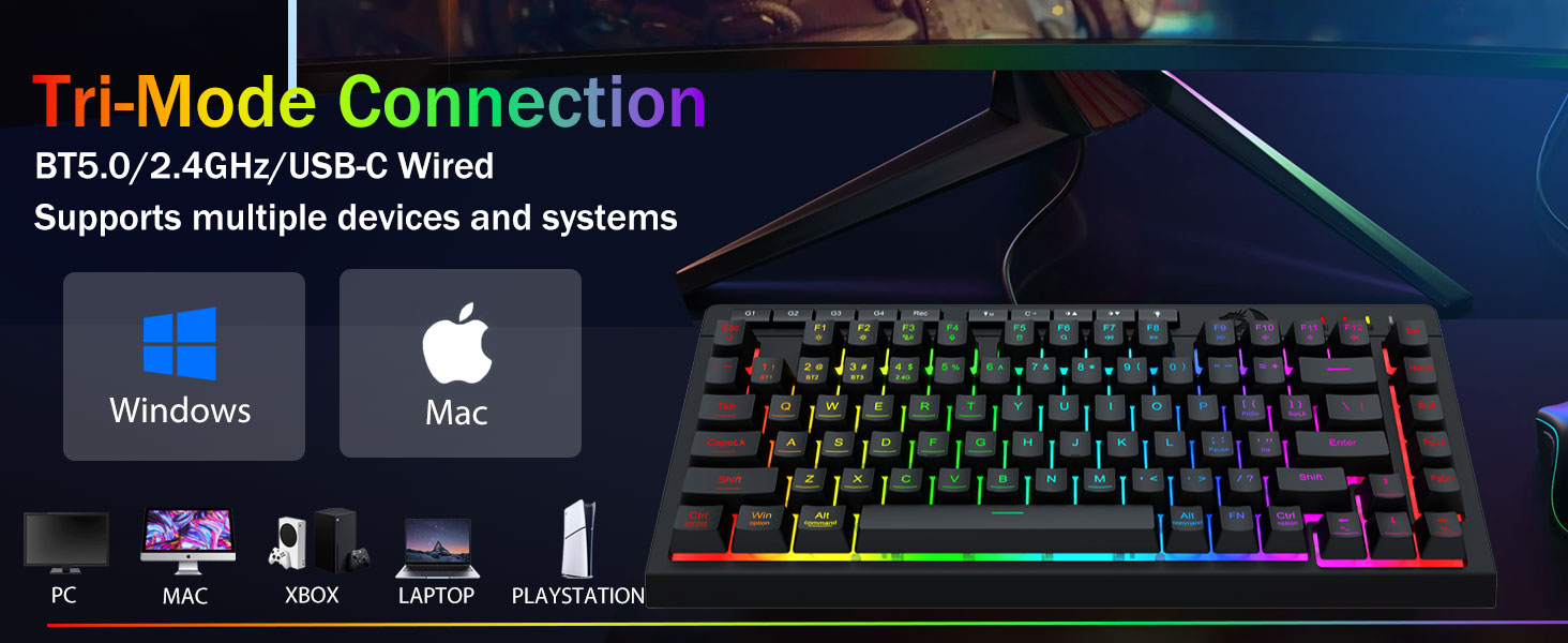Tri-mode Versability & Penguasa Multi-Piranti- Ngalih kanthi lancar ing antarane Bluetooth 5.0, mode WINDELESS Wireless, utawa Wiring USB-C, nyambung nganti 5 piranti, Mac, Mac, Mac, Mac, tab, PS / Xbox).