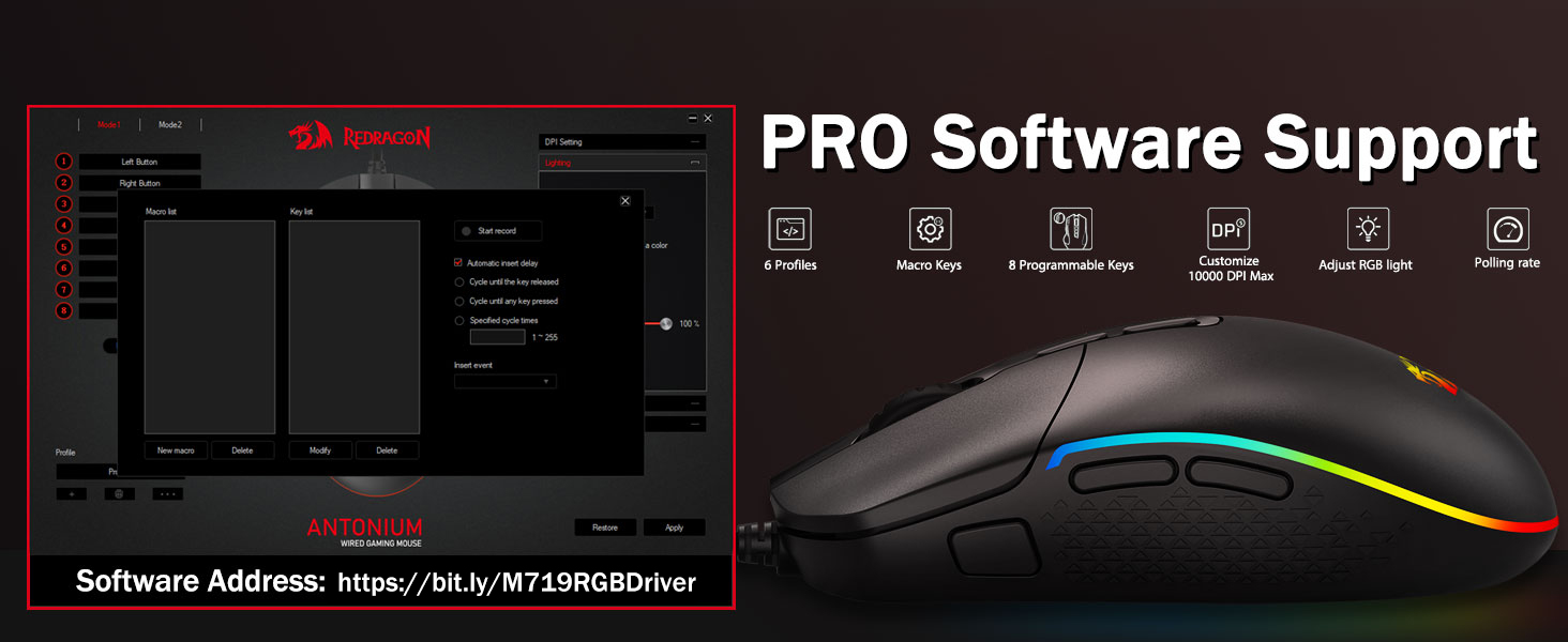 Dhukungan Software -Ngembangake pilihan kanthi nggunakake piranti lunak sing kasedhiya kanggo ngrancang mode lan efek anyar. Macros karo macem-macem keybindings utawa trabasan kanggo karya sing luwih efisien lan game. Link Software: Bit.ly/k524WiredDriver