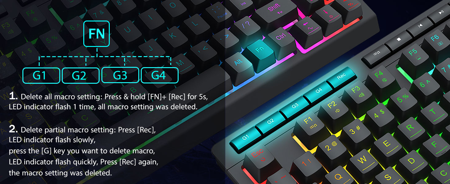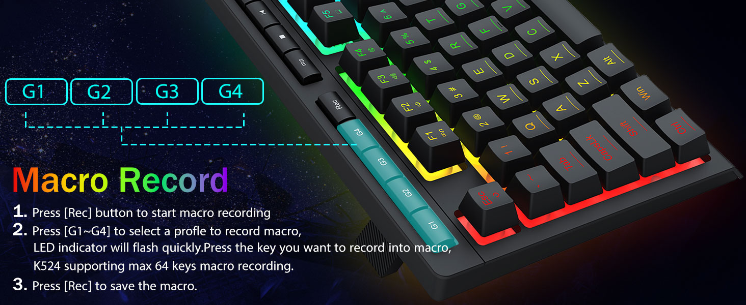 4 tombol macro onboard -4 tombol macro onboard (G1 ~ ~) bisa diprogram lan bisa digunakake ing fly tanpa piranti lunak tambahan. Tombol gampang diowahi lan bisa nindakake macem-macem makro.