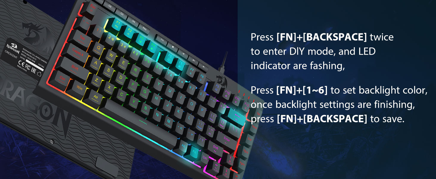 Lampu mburi RGB sing bener -Backlight RGB sing dinamis kanthi lengkap ngidini kemungkinan ora kaetung mung diwatesi mung imajinasi sampeyan. Keyboard dilengkapi karo 8 mode lampu sing wis disetel lan 6 slot kanggo mode sing bisa disesuaikan. Dewan uga ngidini kendali padhang sing ana ing sangisore kanthi padhang banget yen sampeyan ora butuh cahya.
