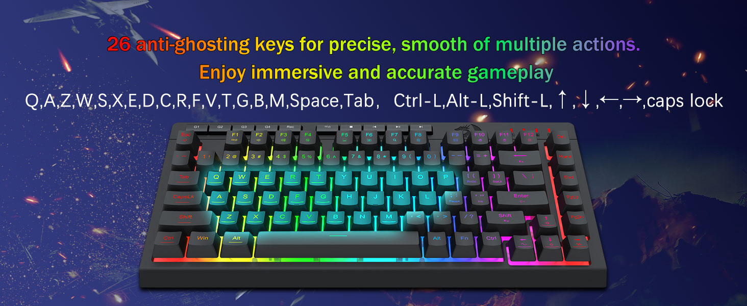 26 Kunci Anti-Ghost & Kontrol media khusus -Nampilake kunci anti-hantu (kunci kanthi undercore) sing ngidini 26 kunci supaya bisa kerja kanthi cepet kanggo tanggapan game sing cepet lan akurat. Kontrol media darmabakti supaya sampeyan muter, ngaso, lan ngliwati multimedia kanthi bener saka keyboard supaya gamelan sampeyan lancar lan ora diganggu.