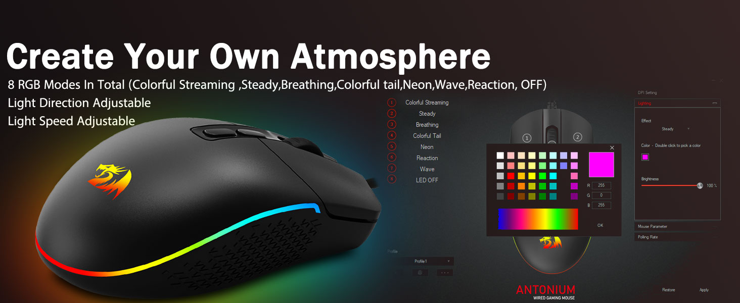 8 mode Backlit RGB sing apik- Nguripake backlit lan nggawe sawetara mateni ing paprangan sampeyan. Vibb backlit RGB sing dibantah RGB sing hyped ora bakal nate ngeculake nalika ndownload ruang game, luwih becik karo aksesoris Redragon liyane kanthi lampu.