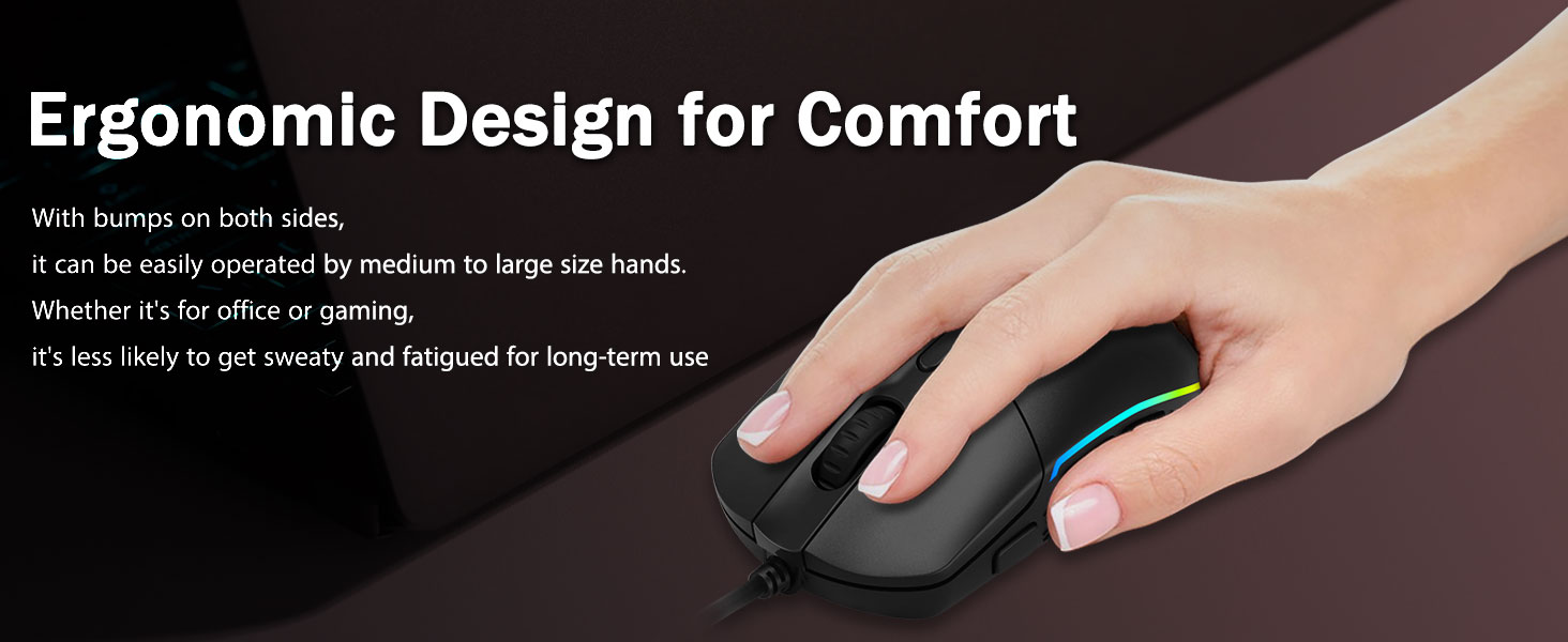 Genggeman panglipur- Benteng ergonom ing loro-lorone ndadekake game tikus cocog karo tangan apa wae. Nyedhiyakake kenyamanan sing dawa kanggo para pemain, tanpa lemes sanajan jam game sing dawa banget. Ora bakal mlebukake nalika ngangkat tikus game, utawa nggawe pandangan sing cepet lan tepat.