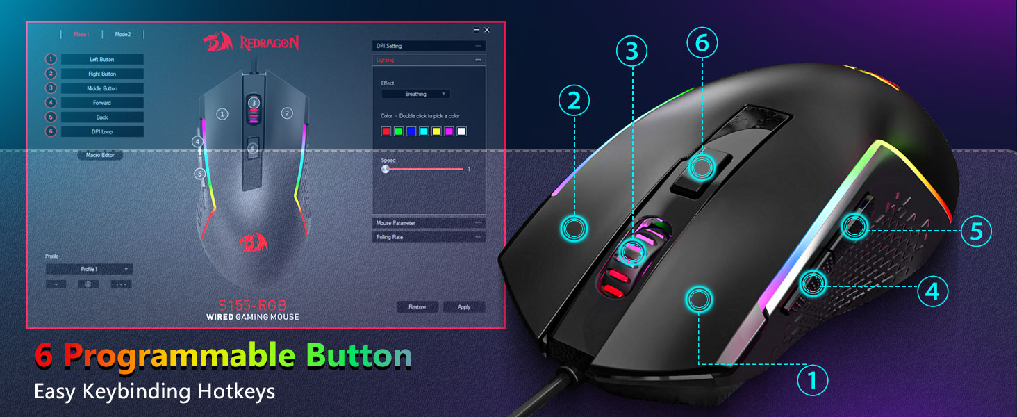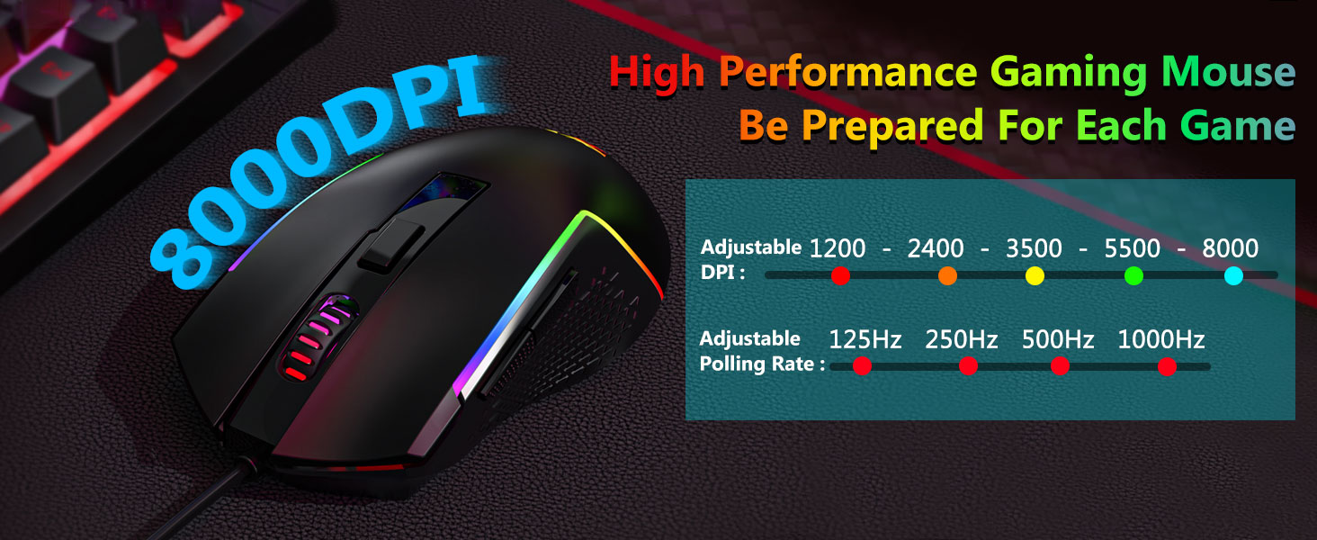 【Mouse game profesional】Sampeyan bisa nyetel DPI saka 1200 nganti 8000 liwat tombol DPI utawa saka 100 nganti 8000 liwat driver piranti lunak supaya bisa beda kabutuhan utawa kerja. Tombol 7 sing 6 sing bisa diprogram. Sensor tliti dhuwur ngirim akurasi pineti nalika switch kelas mikro game njamin umur dawa, luwih saka daya tahan, lan responsif sing luwih gedhe, menehi sampeyan luwih gedhe babagan kompetisi sampeyan. (Piranti lunak uga ndhukung nyetel tarif polling mouse nganti 1000Hz)