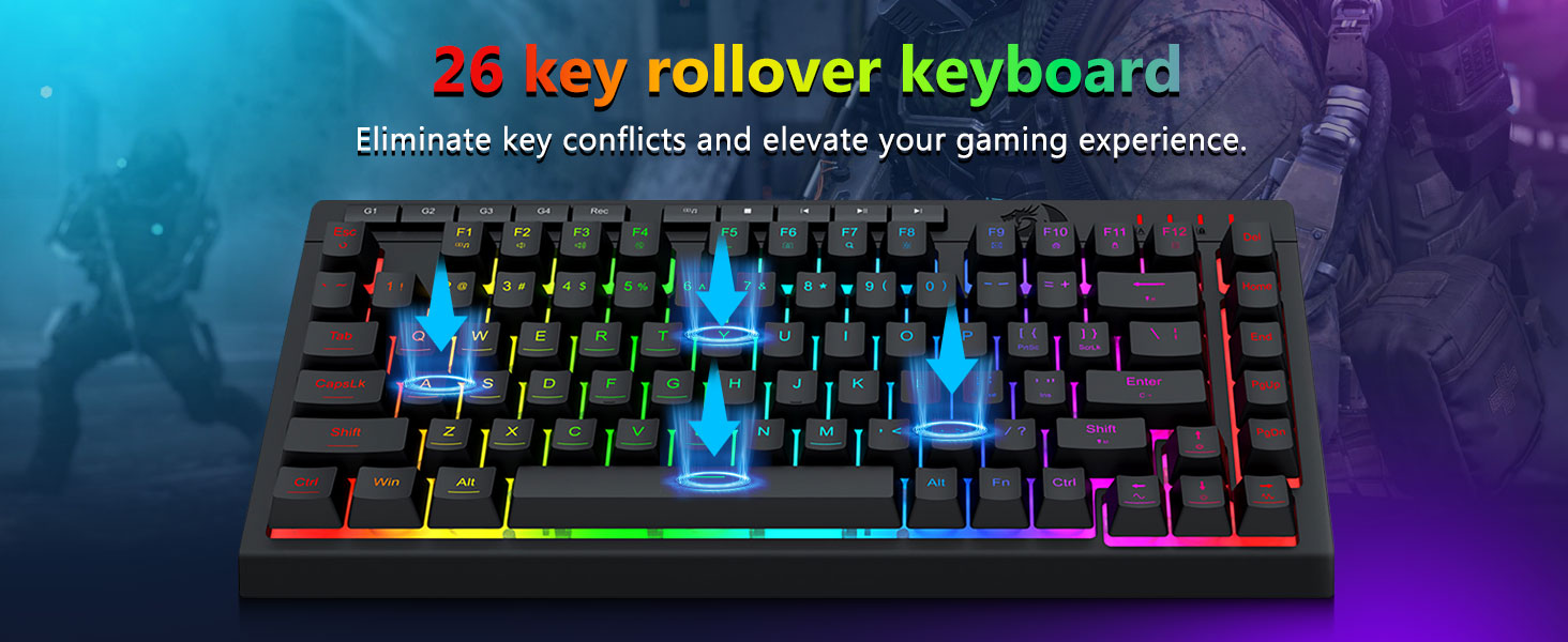 【Game nyaman】Tetep lipat keyboard, lapisan grapyak kulit, lan keycap ngambang nambah panglipur ngetik. 26 Tombol Anti-Ghosting njamin saben tombol bisa dipicu. Tombol menang bisa dipatèni kanggo game. Keyboard iki darmabakti kanggo nyedhiyakake pengalaman game sing efisien nalika njamin kepenak maksimal