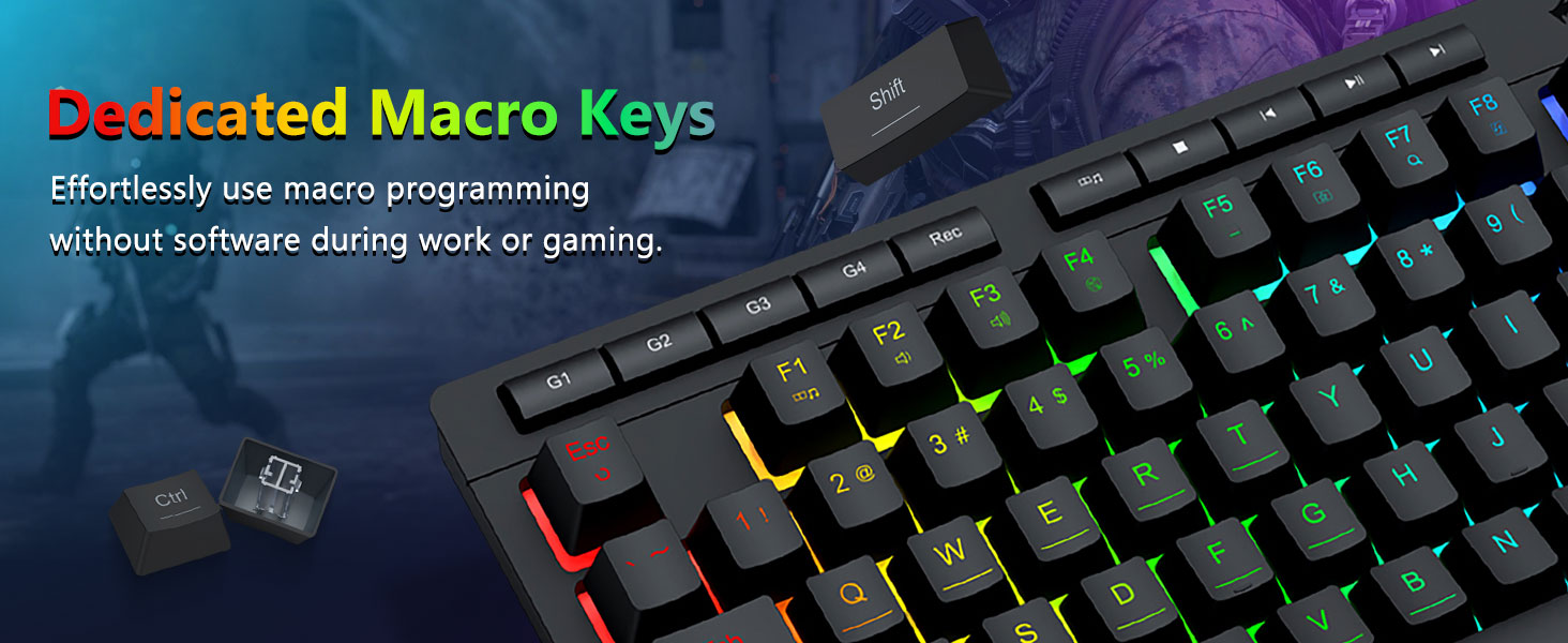 【Efisien & trep】Keyboard game lan mouse iki dilengkapi 4 tombol macro 4, 5 tombol multimedia independen lan 12 FN Multimedia tombol, gampang lan trep kanggo operate. Iki ora mung nambah efisiensi nanging uga proses game luwih trep lan luwih cepet