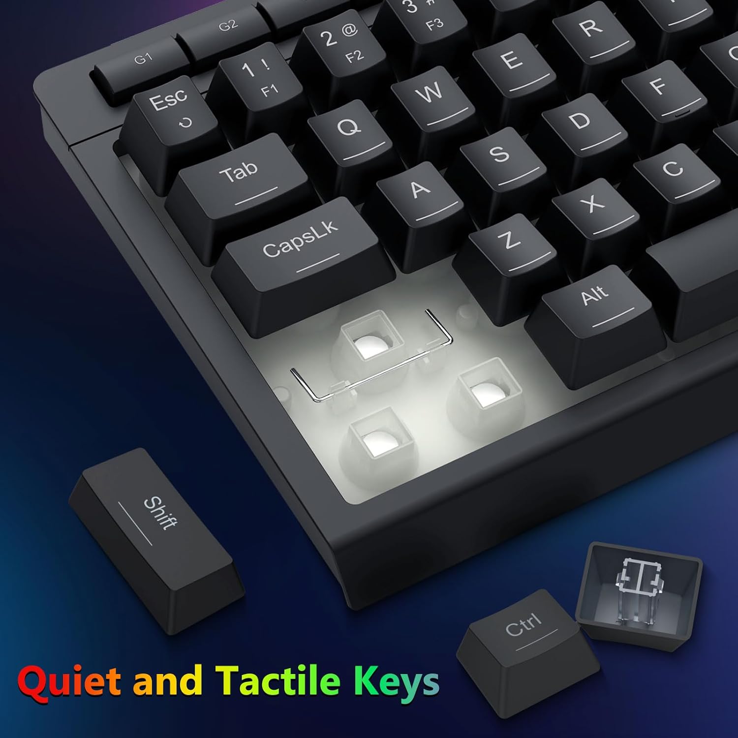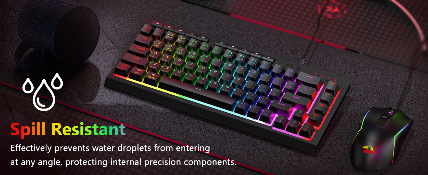 Keycaps dirancang kanggo kekiatan lan tekstur sing konsisten, mbantu njaga kenyamanan sajrone wektu sing suwe. Cahya RGB disebarake kanthi merata, nambah visibilitas tanpa gangguan.