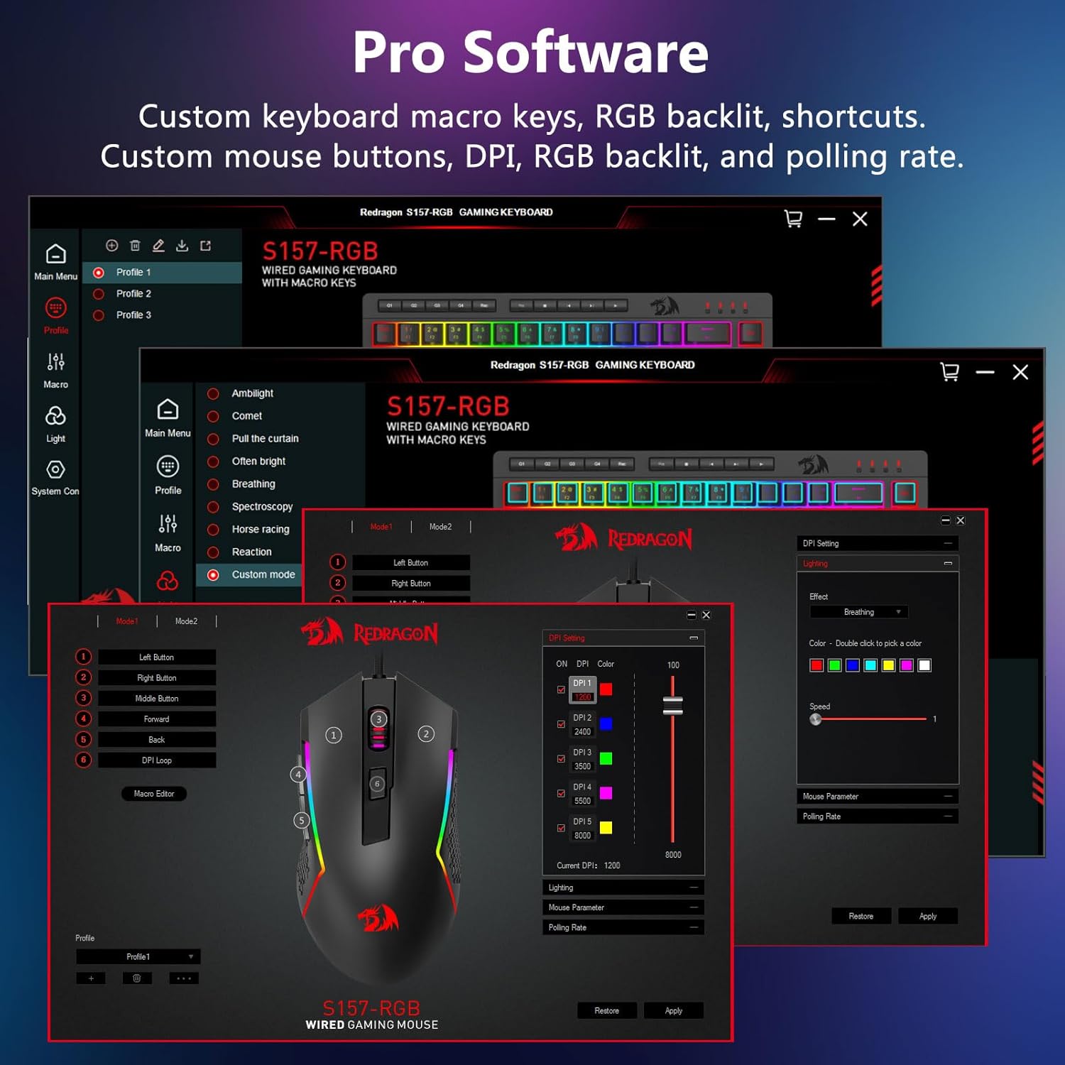 Black S157 RGB Backlit Wired Gaming Keyboard lan Mouse Combo nyedhiyakake kinerja sing konsisten ing macem-macem skenario. Papan tombol ndhukung ketukan tombol sing akurat, dene mouse nyedhiyakake pelacakan sing dipercaya kanggo navigasi lan gamelan.