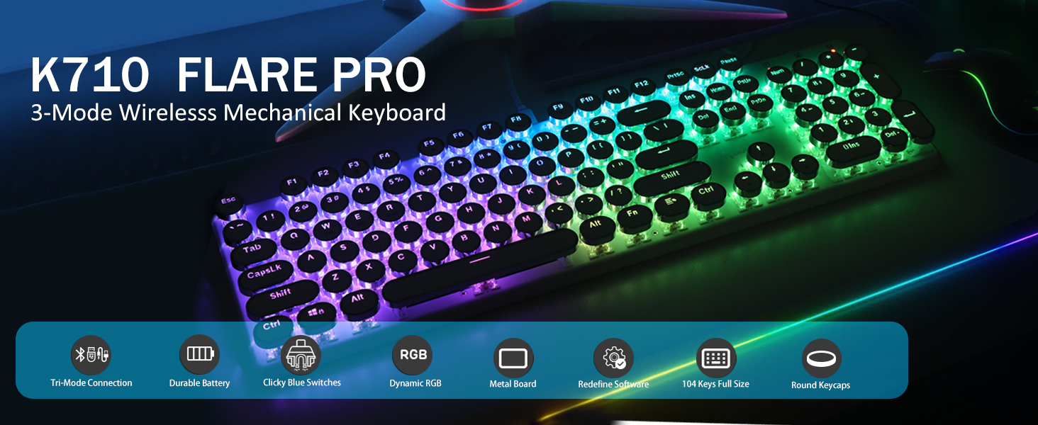 𝗩𝗶𝗯𝗿𝗮𝗻𝘁 𝗚𝗿𝗼𝗼𝘃𝘆 𝗥𝗚𝗕- Versi Flare Pro sing nganyari tetep nggunakake bahan logam tank-solid sing padha. Tansah keyboard kanthi stabil lan elegan ing mejo, kanggo pengalaman ngetik premium. Keyboard K710 ndhukung teknologi anti-ghosting 104-kunci 104-kunci, ngidini pirang-pirang tombol dipencet ing wektu sing padha tanpa konflik.