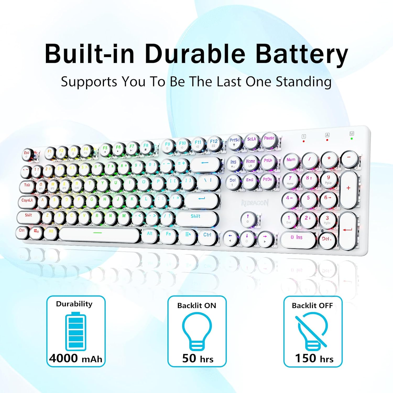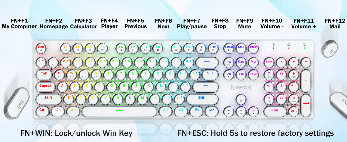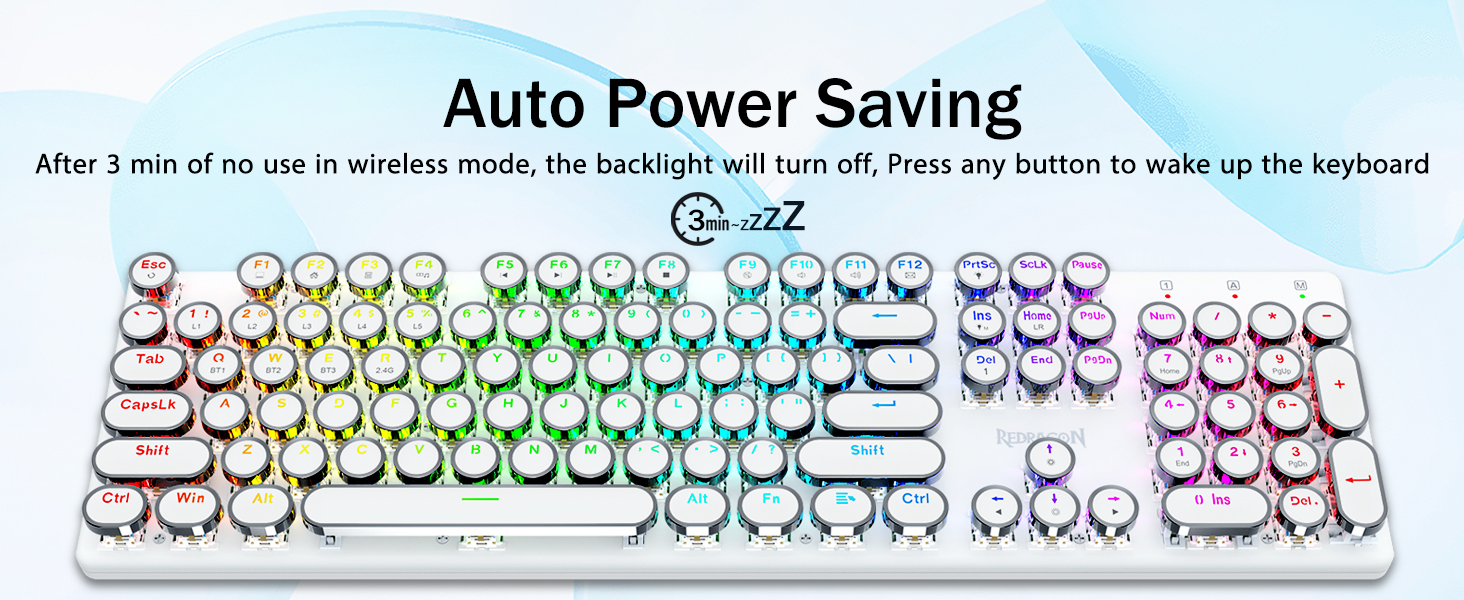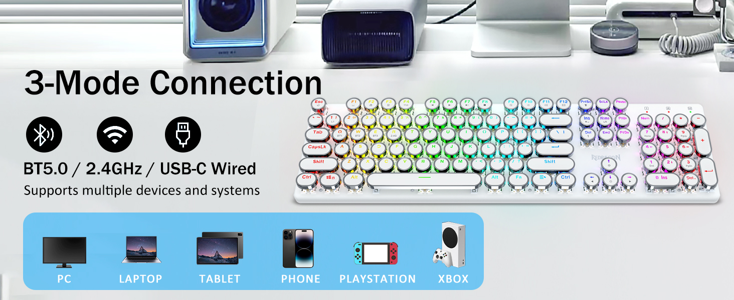 𝟯-𝗠𝗼𝗱𝗲 𝗖𝗼𝗻𝗻𝗲𝗰𝘁𝗶𝗼𝗻- Geared karo teknologi sambungan Tri-mode Redragon inovatif, USB-C C Bluetooth 3.0 / 5.0 & 2.4GHz mode nirkabel sing nggawe pangguna pangguna nganyari menyang tingkat liyane ing kabeh lapangan. Pencet FN / W / E kanggo mode Bluetooth, pencet mode FN + R nganti 2.4G.